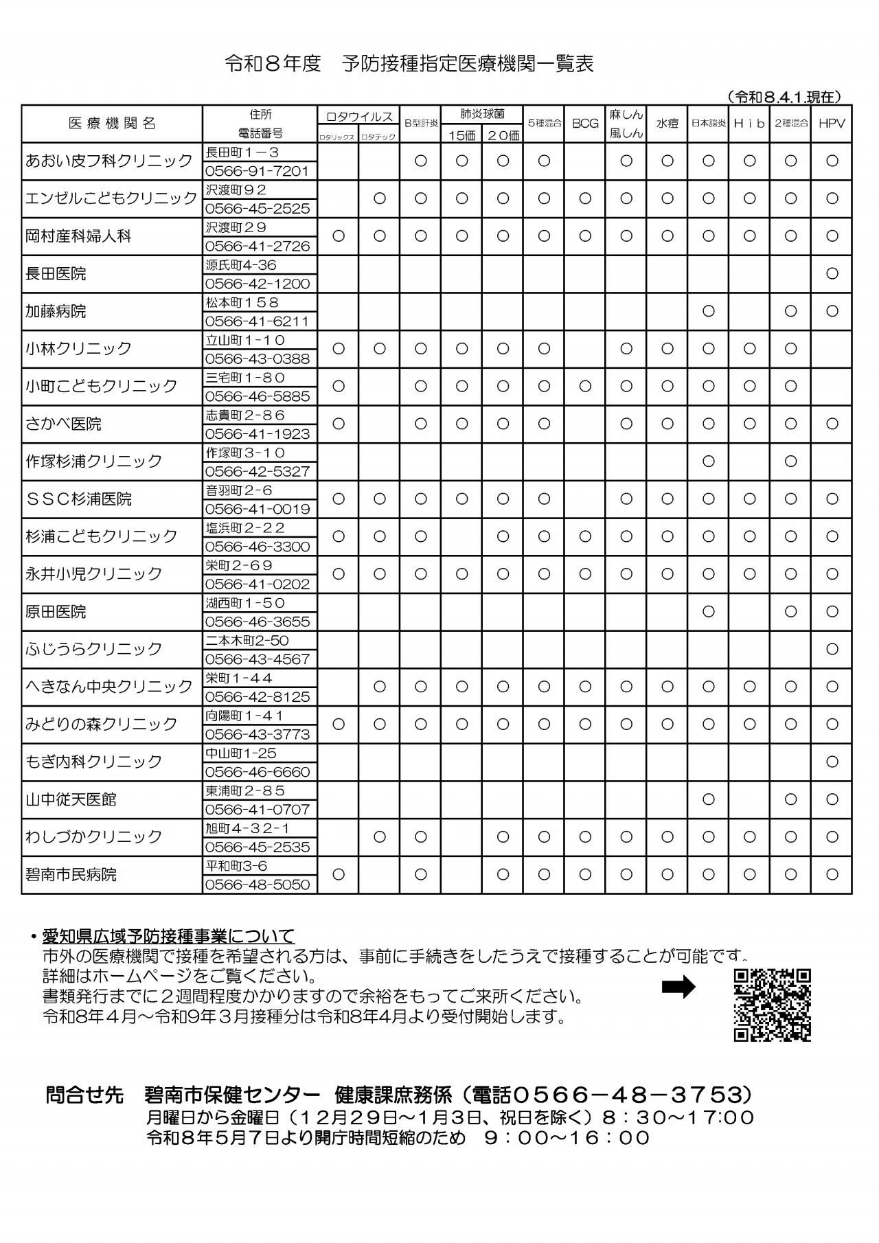 令和8(2026)年度定期予防接種指定医療機関一覧